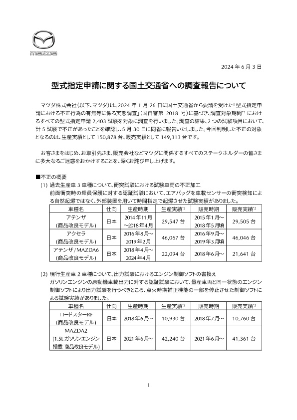 この度はマツダ株式会社の「型式指定申請における不正行為の有無等に係る実態調査」における不正行為により、ご迷惑とご心配をおかけすることとなり、心よりお詫び申し上げます。