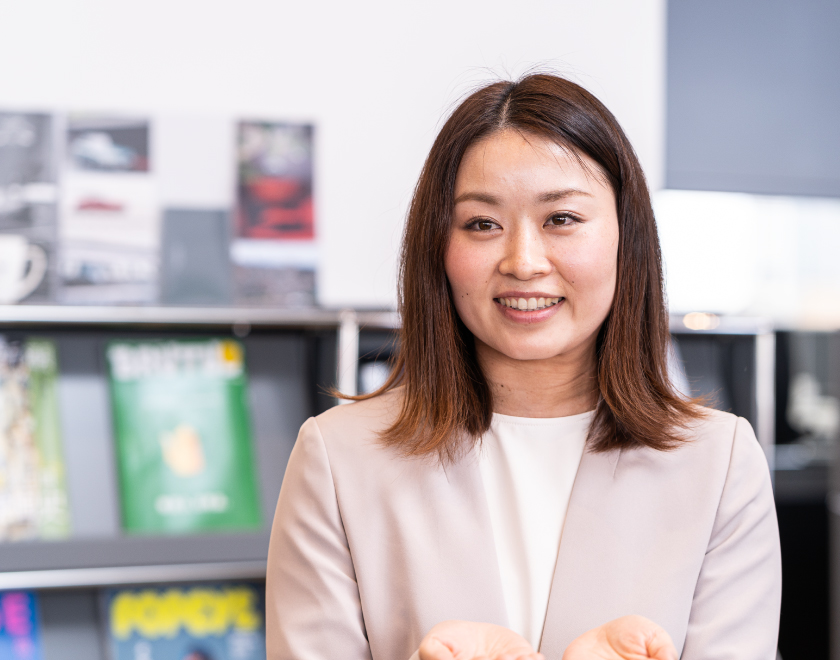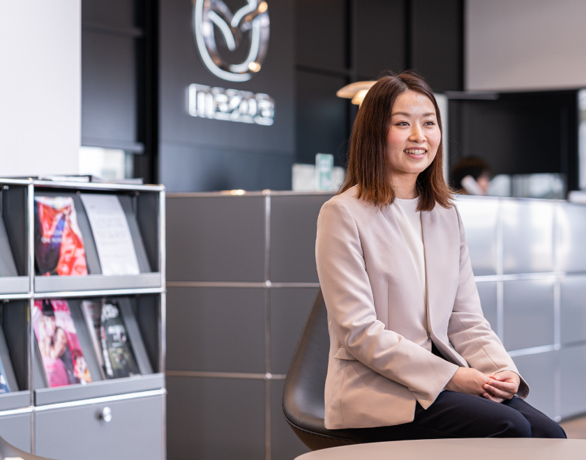 専門学校を卒業後、一度は別の仕事に就きましたが、その後の転職活動の中で、西九州マツダの事務スタッフとして働いていた友人の誘いもあって志望。入社に繋がりました。私のいる店舗はスタッフ同士の仲も良くて、とても働きやすい環境だと思います。コミュニケーションが円滑なので、分からないことがあると、別の部署の方にすぐに質問して把握することができます。