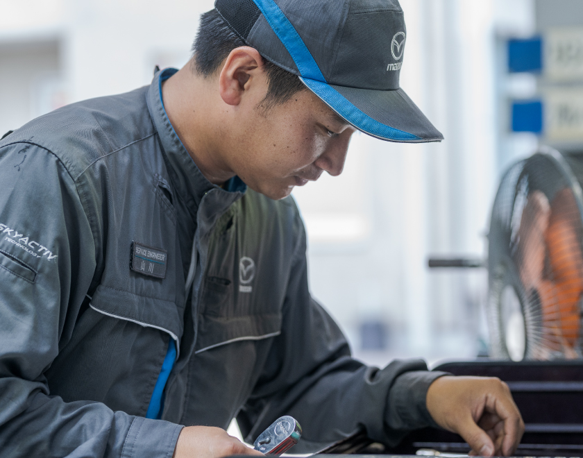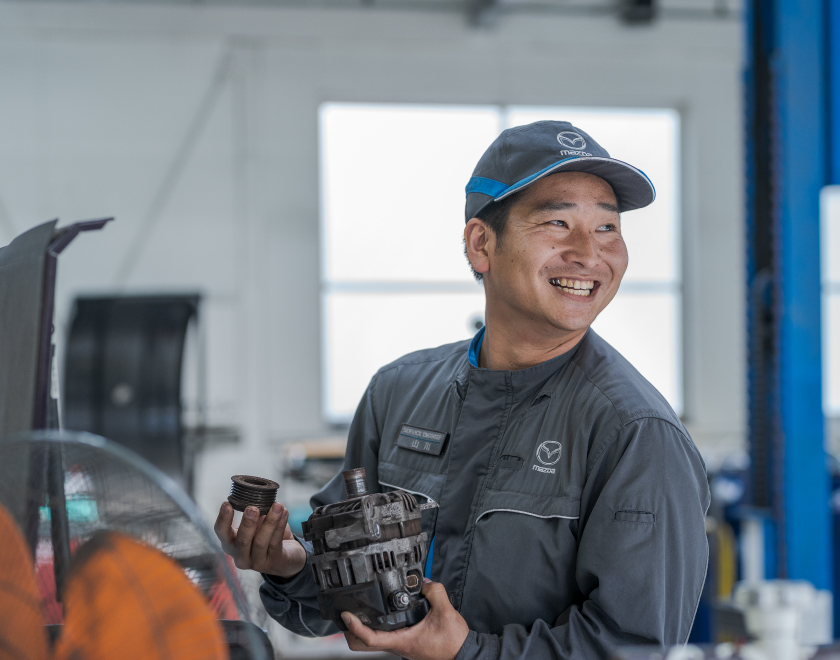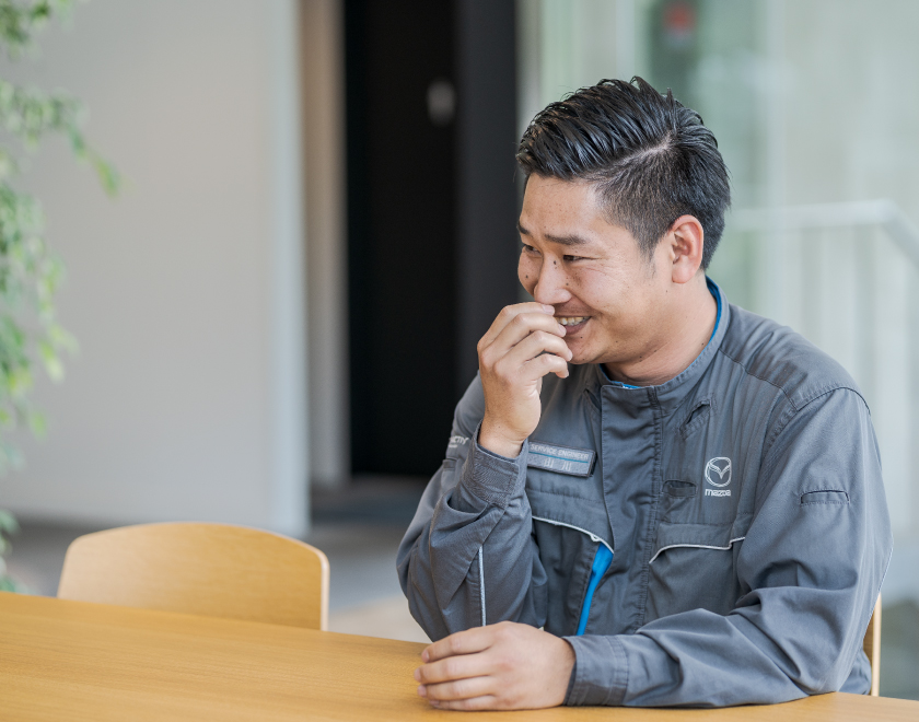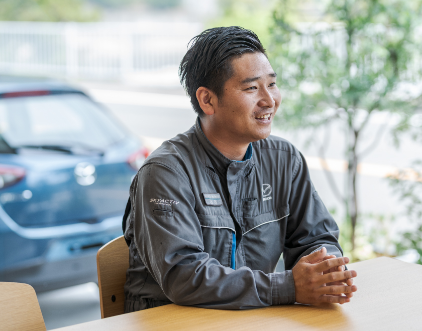 社員同士のコミュニケーションはとても円滑で、整備スタッフはもちろん、他の部署とも話しやすい関係です。仕事の小さな疑問点もすぐに答えてくれるし、明るく相談しやすい雰囲気だと感じています。僕はもともと人見知りするタイプですが、先輩から進んで声をかけてくれて今ではすっかり仲良しです。ときには冗談を言い合いながら、でもやるべきことは真面目にしっかりと。そうした切り替えがうまくできているのも西九州マツダの整備スタッフの特徴です。